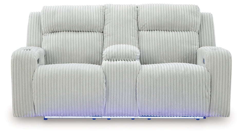 Trend-right style, meet irresistible modern function. Your living room gets a cozy-cool upgrade with the TwinBrooke power reclining loveseat. Curl up in its ultra-chic corded upholstery and recline with one-touch controls. Is it movie night or game time? With ambient LED lighting, this loveseat transforms from a serene relaxation spot to an entertainment hub.